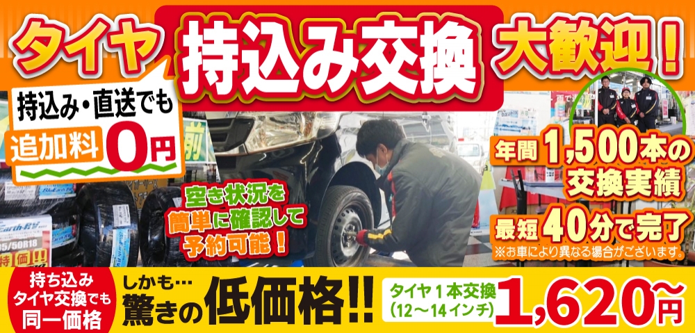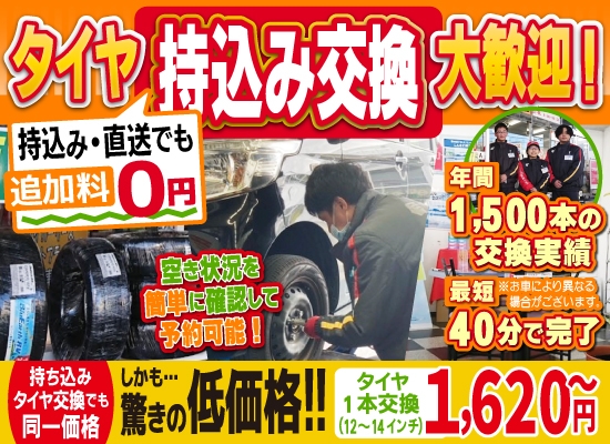 多くのお客様から持ち込み交換のご要望を頂いており、また、最近はネットで購入した格安タイヤやスタッドレスタイヤへの交換ニーズもある為、当店ではより便利なショップを目指し、交換のみのお客様も大歓迎しております。